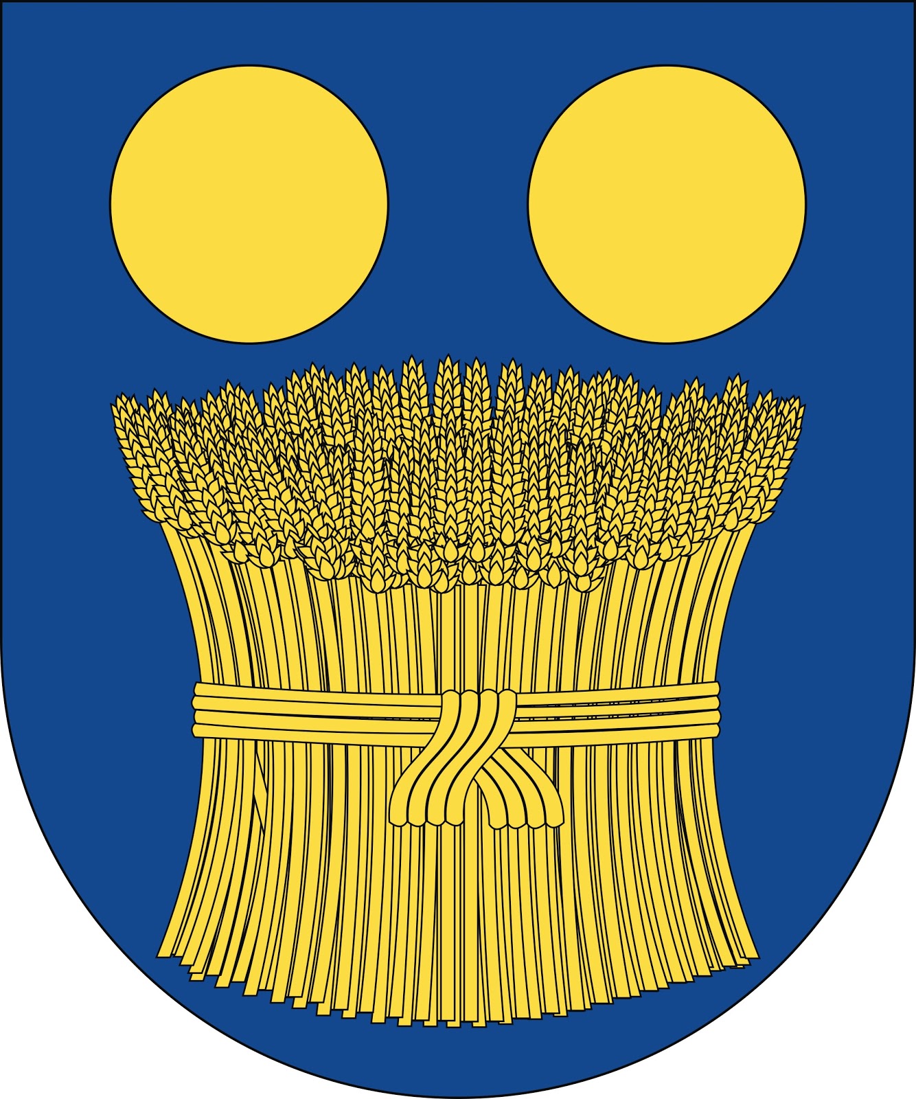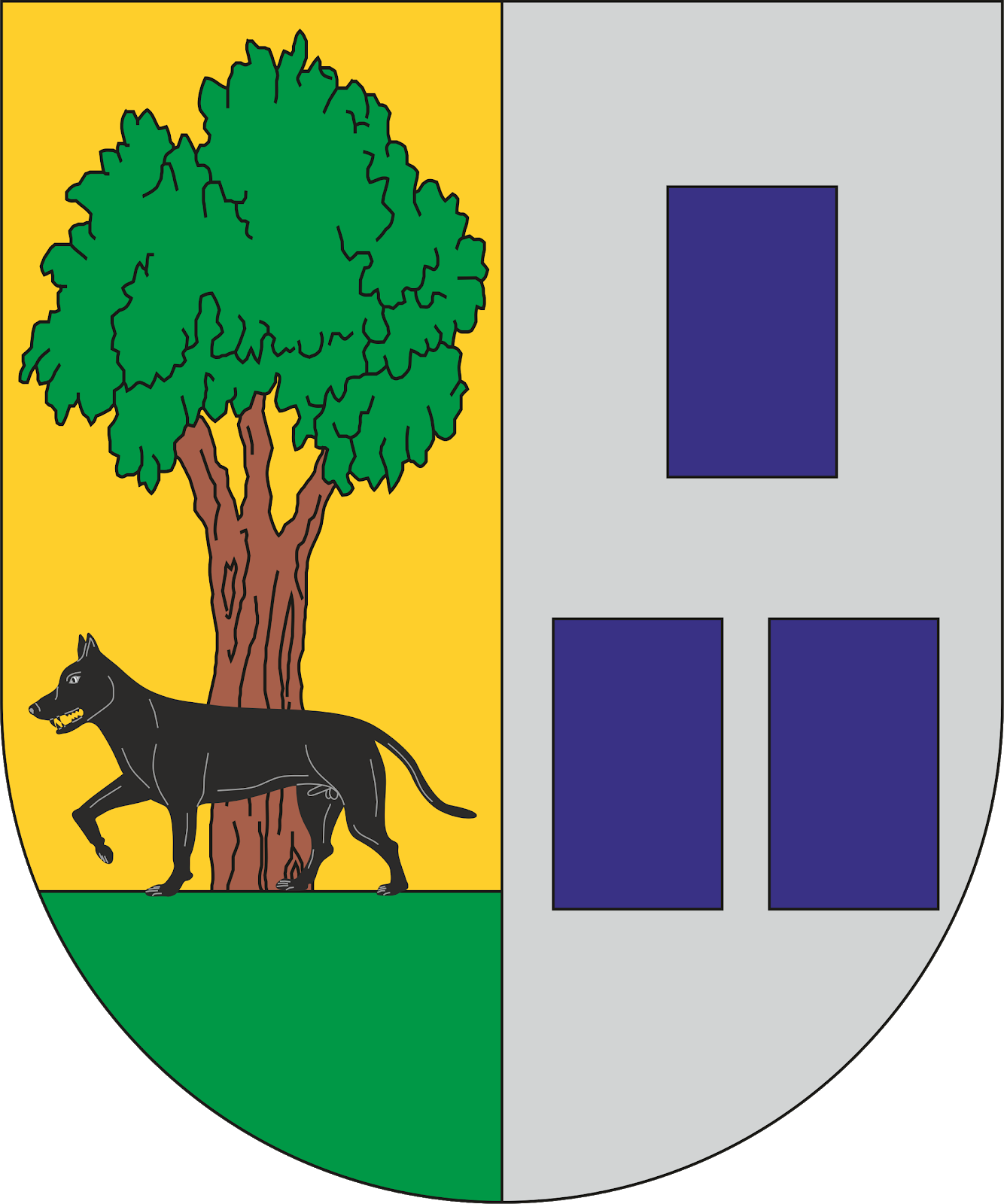 Partido: 1º, en campo de oro, un árbol de sinople, terrasado de lo mismo y con un lobo de sable, pasante y atravesado al tronco. 2º, en campo de plata, tres billetes de azur, mal ordenados.