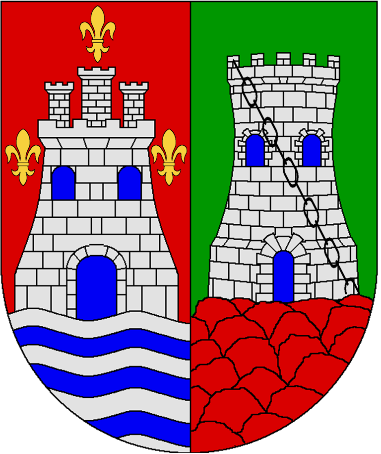 Partido: 1º, en campo de gules, sobre ondas de azur y plata, un castillo de plata, almenado, mazonado y aclarado de azur, acompañado de tres flores de lis de oro, una en jefe y las otras a los flancos, y 2º, en campo de sinople, sobre peñas de gules, una torre de plata, almenada, mazonada de sable y aclarada de gules, y brochante en banda, una cadena de sable desde las almenas a su base.
