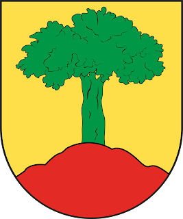 De plata, un árbol de sinople con dos lobos de sable atravesados en su tronco; la bordura de gules con ocho aspas de oro.