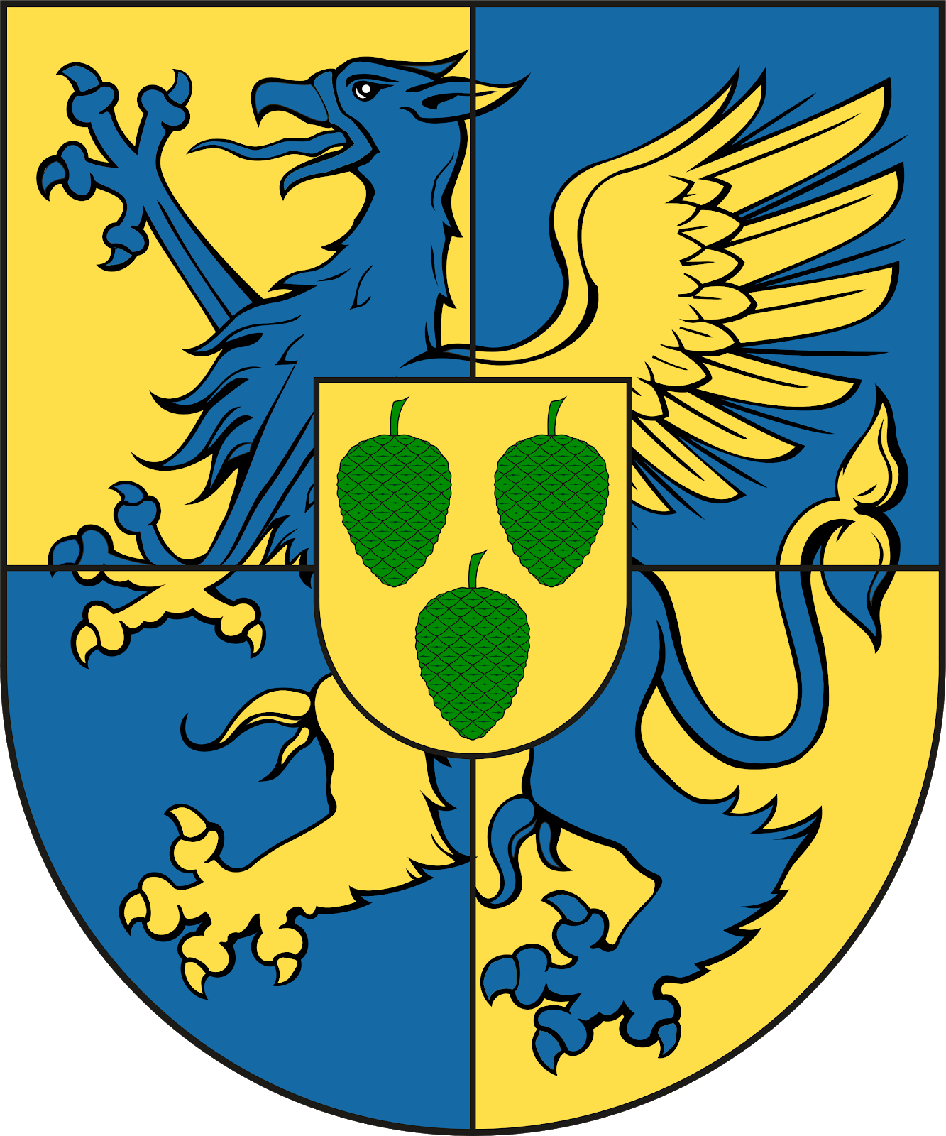 Cuartelado: 1º y 4º, de oro; 2º y 3º, de azur; brochante sobre el todo un grifo de lo uno en lo otro. Escusón de oro con tres piñas de sinople, bien ordenadas.