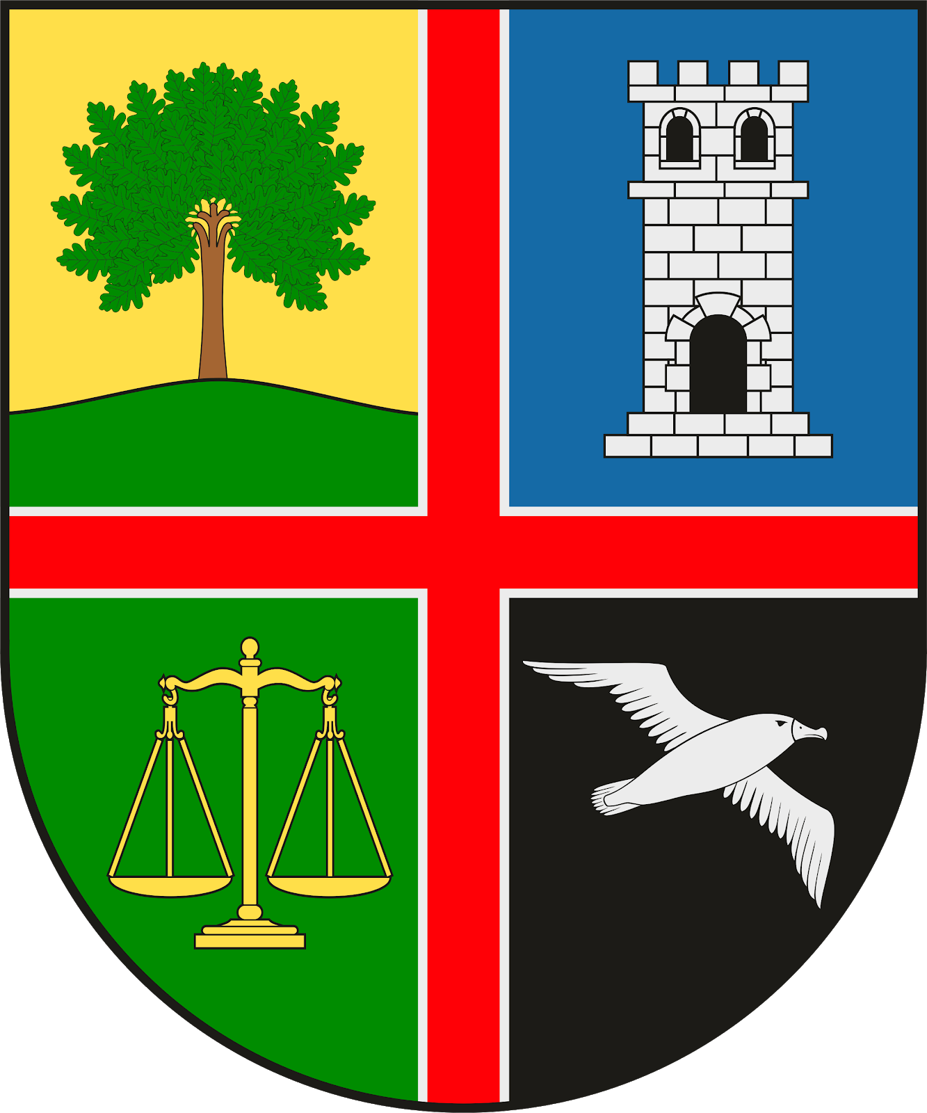 Cuartelado por una cruz estrecha de gules perfilada de plata: 1º, de oro, un roble de sinople con el tronco de su color, sobre un monte de sinople; 2º, de azur, una torre almenada de plata; 3º, de sinople, una balanza de oro; 4º, de sable, un albatros de plata, en vuelo.